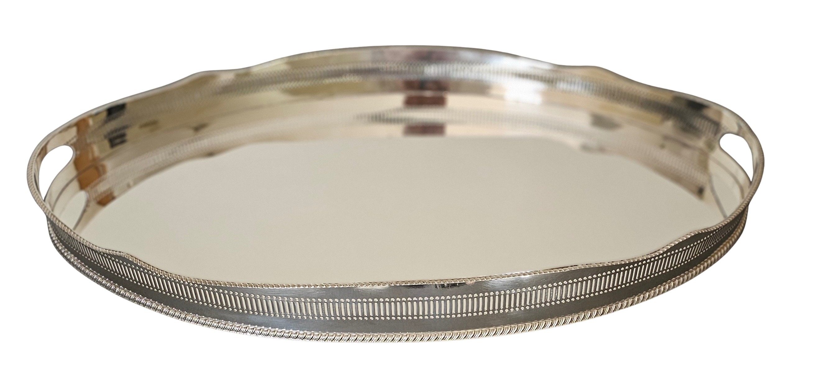 Tray with Oval Gallery & Cut-Out Handles with Pod Feet 24' Silver Plate. SKU #: S62/24.