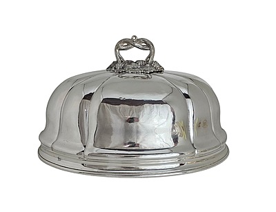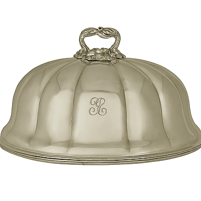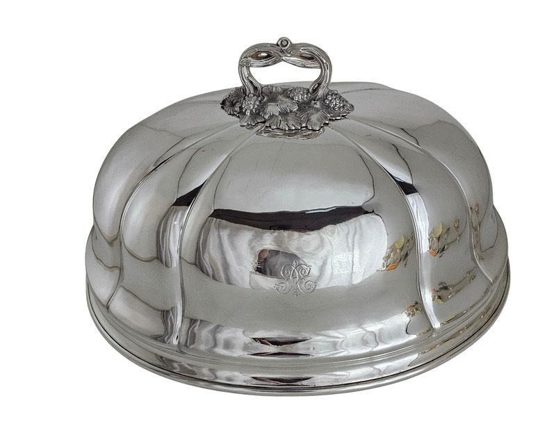 Old Sheffield Plate Melon-Shaped Dome with Sterling Inset, c.1810. An exquisite example of early 19th-century craftsmanship, this melon-shaped food dome is formed in Old Sheffield Plate, dating to circa 1810. Its bold, fluted contours evoke the organic elegance of a ripened melon, while the elaborate handle—richly detailed and sculptural—adds a regal flourish to its silhouette. Notably, the original square inset of sterling silver is discreetly embedded on one side. This rare feature was traditionally reserved for engraved family crests or presentation motifs, and its untouched condition speaks to the dome’s authenticity and provenance. The silver surface retains its original patina, offering collectors a glimpse into the refined dining rituals of Georgian England. Whether displayed as a centerpiece or used in formal service, this dome embodies heritage, artistry, and enduring charm.