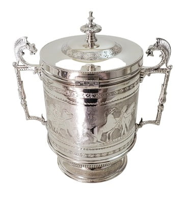 Biscuit Box Crested with Superb Roman scenes English Silver Plate c.1875