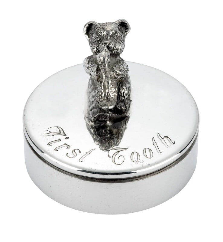 First Tooth Box Bear on Round Box Design Fine English Pewter 1 5/8" Round x 1.5" H with Bear. B...