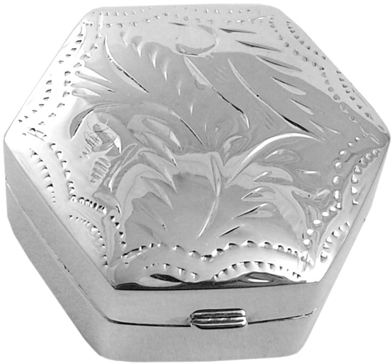 Pillbox Engraved 6 Sided 1.25" X 1.25" English Sterling Silver. SKU #: PB419.