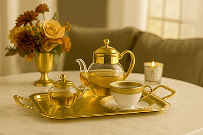 | Small Oblong Tray/Handles 1 1/4"h x 9 5/8" x 17 1/4"l English Silver Plate Tarnish Resistant (Gold Finish) |