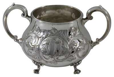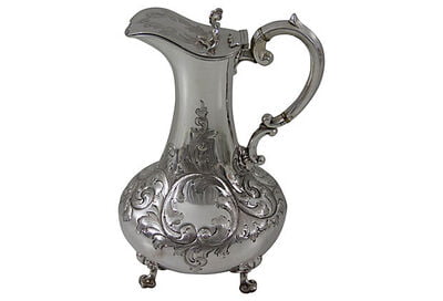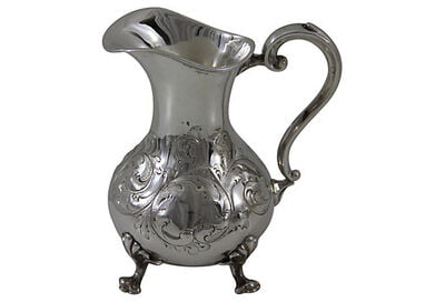 Four-piece embossed silver-plate tea and coffee set, including a coffeepot, teapot, sugar bowl, and cream jug. All four pieces sit on elaborate feet. Made in England circa 1850. Coffeepot, 7"Dia x 10.75"H; teapot, 10.25"Dia x 7"H; sugar bowl, 8.75"Dia x 5.25"H; cream jug, 5"Dia x 5.75"H.
