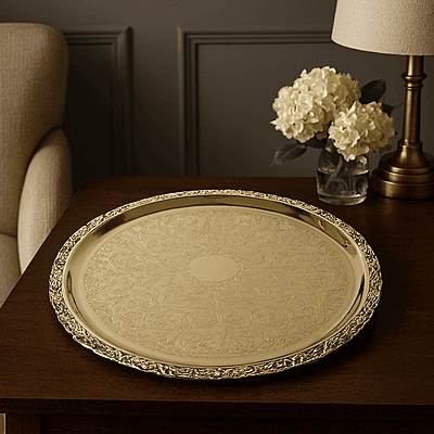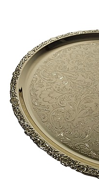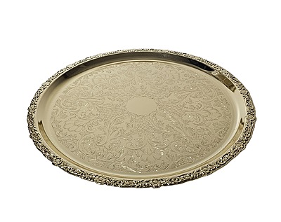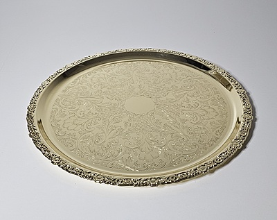 Silver Plated Large Round Flat Patterned Tray Dimensions: 14 1/3" (Gold Finish)