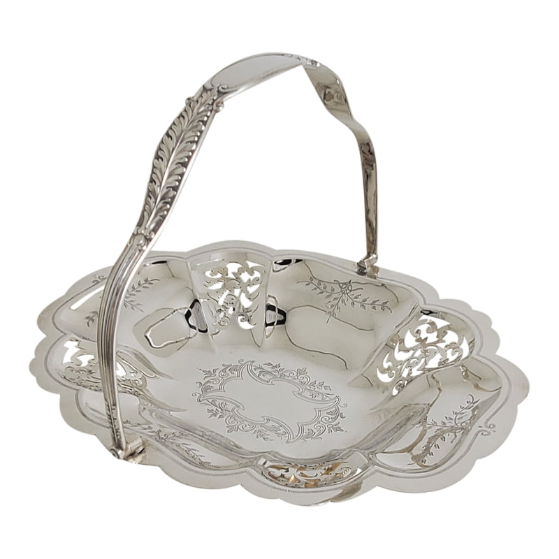 Engraved and fluted silver-plate basket with hinged handle and crimped edge. The base of this basket has bead edging. Made in England, circa 1890.