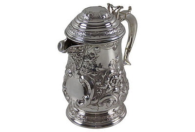 English silver-plate jug with lid, circa 1875. Features a large cartouche, which is suitable for engraving. Maker's mark on underside.