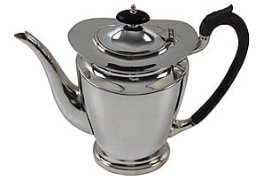 Silver-plate coffeepot with wood handle, circa 1885. Maker's mark on underside.