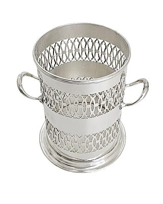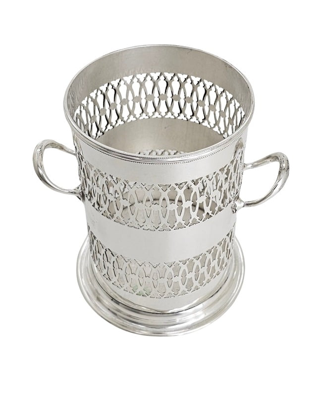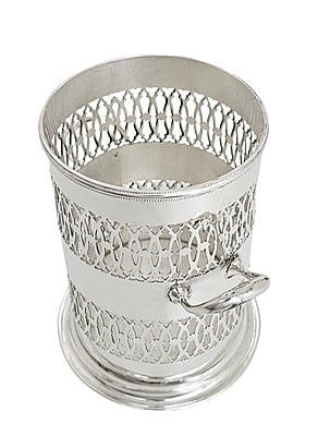 A silver plate syphon stand is a type of holder for a glass bottle that originally contained carbonated water or soda. Syphons were popular in the 19th and early 20th centuries as a way of dispensing fizzy drinks at home or in bars. A syphon stand is usually made of metal, often silver or silver plated, and has a circular opening at the top to fit the base of the bottle. The stand may have handles, feet, or a pedestal to make it easier to carry or display. The stand may also have decorative features, such as piercing, engraving, or motifs.