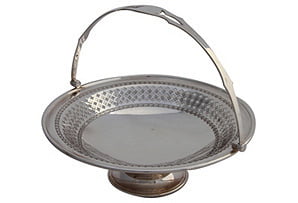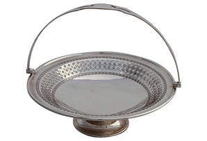 Round pierced silverplate basket on stand with swing handle. England, circa 1880.