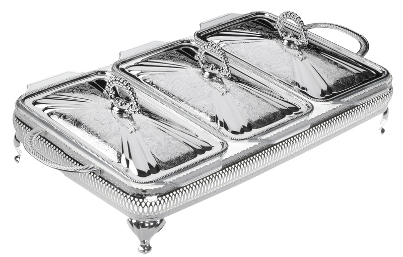 Queen Anne Triple Casserole/Lids 6"h x 10"w x 20 1/4"l English Silver Plate (Tarnish Resistant). SKU #: 0/6303.