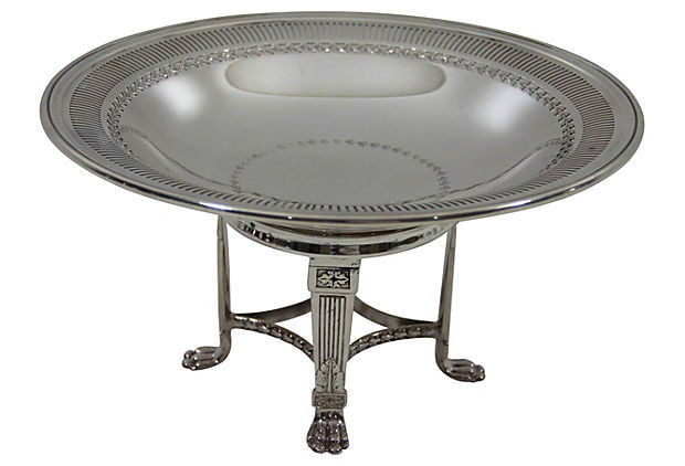 Round pierced dish on stand with three paw feet. Base in removable. Made in England silver plate, circa 1880.