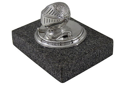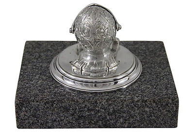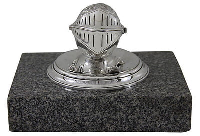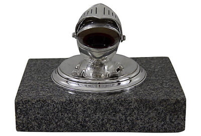 Silver-plated armor helmet ink stand on a heavy granite base. Lift the visor to access the cranberry glass ink well. Made in England circa 1875.