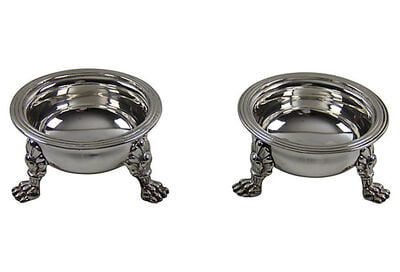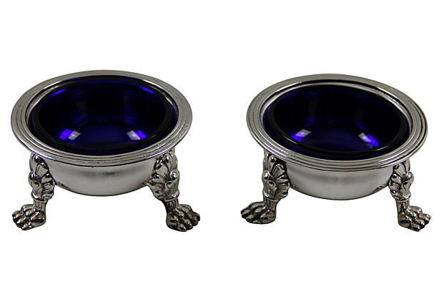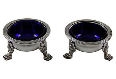 Pair of English Georgian sterling silver salt cellars on paw feet with blue cobalt inserts circa 1740