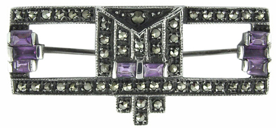 Brooch Long Rectangular Shaped with Amethyst and Marcasite Sterling Silver