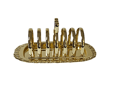 Ornate Toast Rack with Floral Tray Gold Finish over Silver Plate. Elevate your breakfast presentation with this exquisite gold and silver-plated toast rack, gracefully mounted on an ornate oval tray. Featuring six elegantly curved slots and a central handle for easy serving, this piece blends functionality with timeless charm. The tray’s intricate floral border evokes classic English silverware traditions, making it ideal for formal dining, boutique hospitality settings, or as a refined gift for collectors of heritage tableware. Please Check the size of your toast the gap between each bar is 1/2".