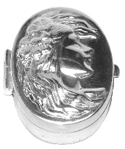 Pillbox Oval Shaped Engraved Lady with Flower in Hair Design 1 3/8" X 1" English Sterling Silver. SKU #: PB401.