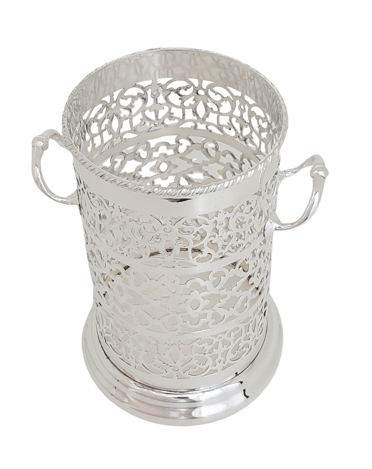 A silver plate syphon stand is a type of holder for a glass bottle that originally contained carbonated water or soda. Syphons were popular in the 19th and early 20th centuries as a way of dispensing fizzy drinks at home or in bars. A syphon stand is usually made of metal, often silver or silver plated, and has a circular opening at the top to fit the base of the bottle. The stand may have handles, feet, or a pedestal to make it easier to carry or display. The stand may also have decorative features, such as piercing, engraving, or motifs.