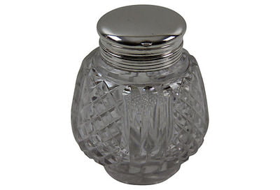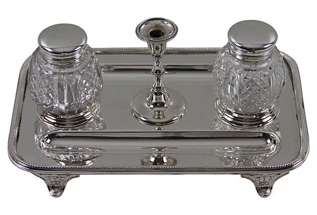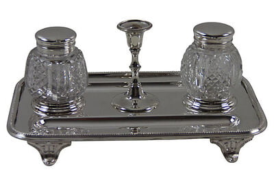 English silver-plate inkstand featuring cut-glass inkwells with silver-plate lids. The stand has a beaded edge and candleholder in the center. Circa 1870.
