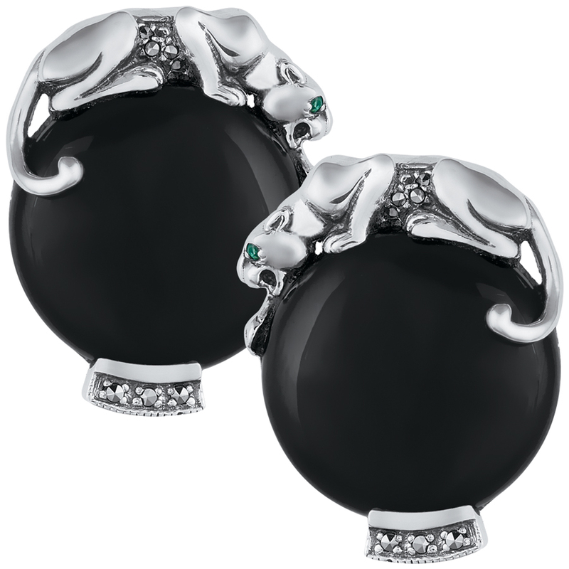 Earrings Panther on Onyx, Marcasite & Emerald with Post and Safety Clip English Sterling Silver ...