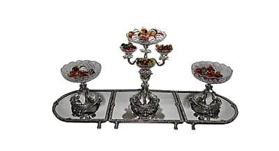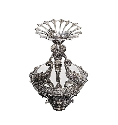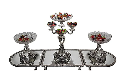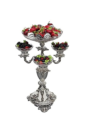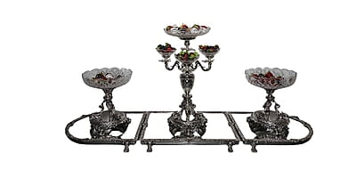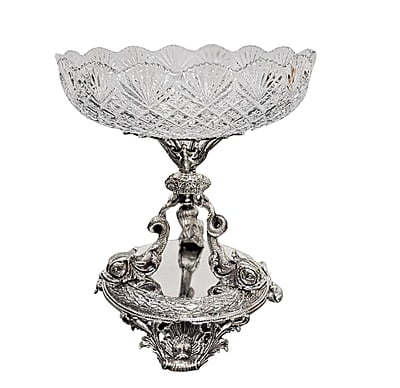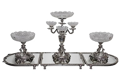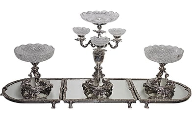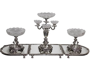- Epergne: Featuring one large cut glass bowl (9.75" diameter) and three smaller cut glass bowls (4.75" diameter each), all set on an ornate silver stand. The epergne stands 20.5" high, showcasing intricate detailing.