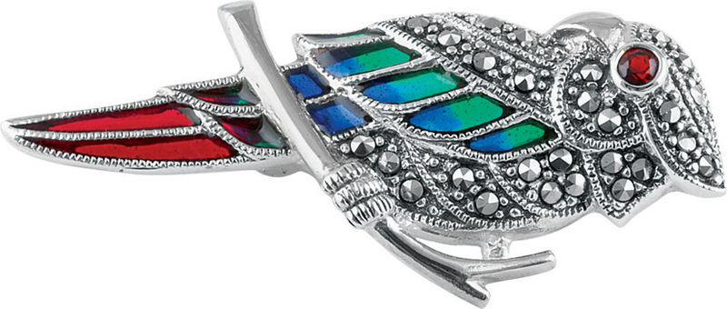 Brooch Enamel Parrot Marcasite and Garnet Set Red, Blue and Green Sterling Silver 1 5/8" x 3/4". SKU #: B366.